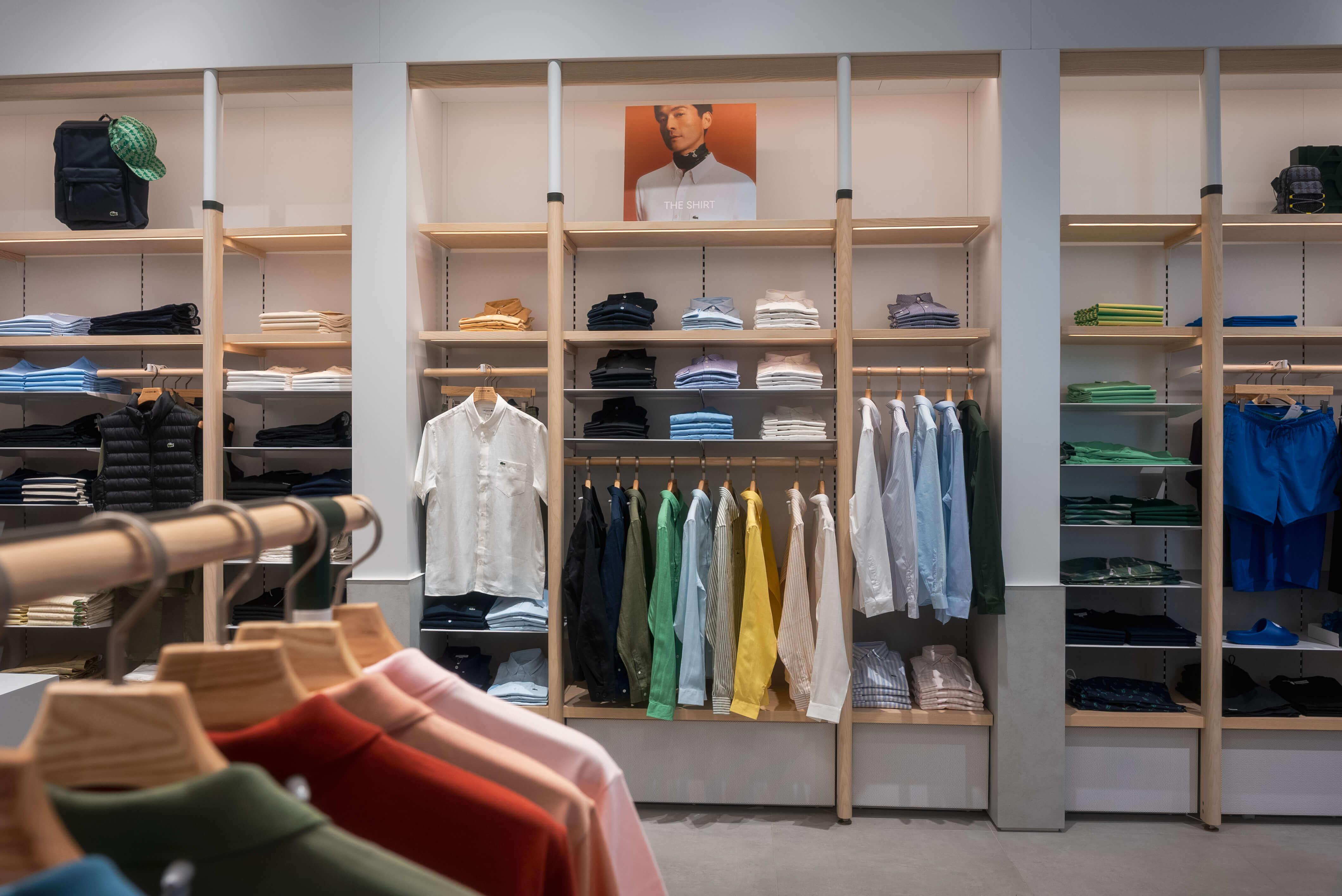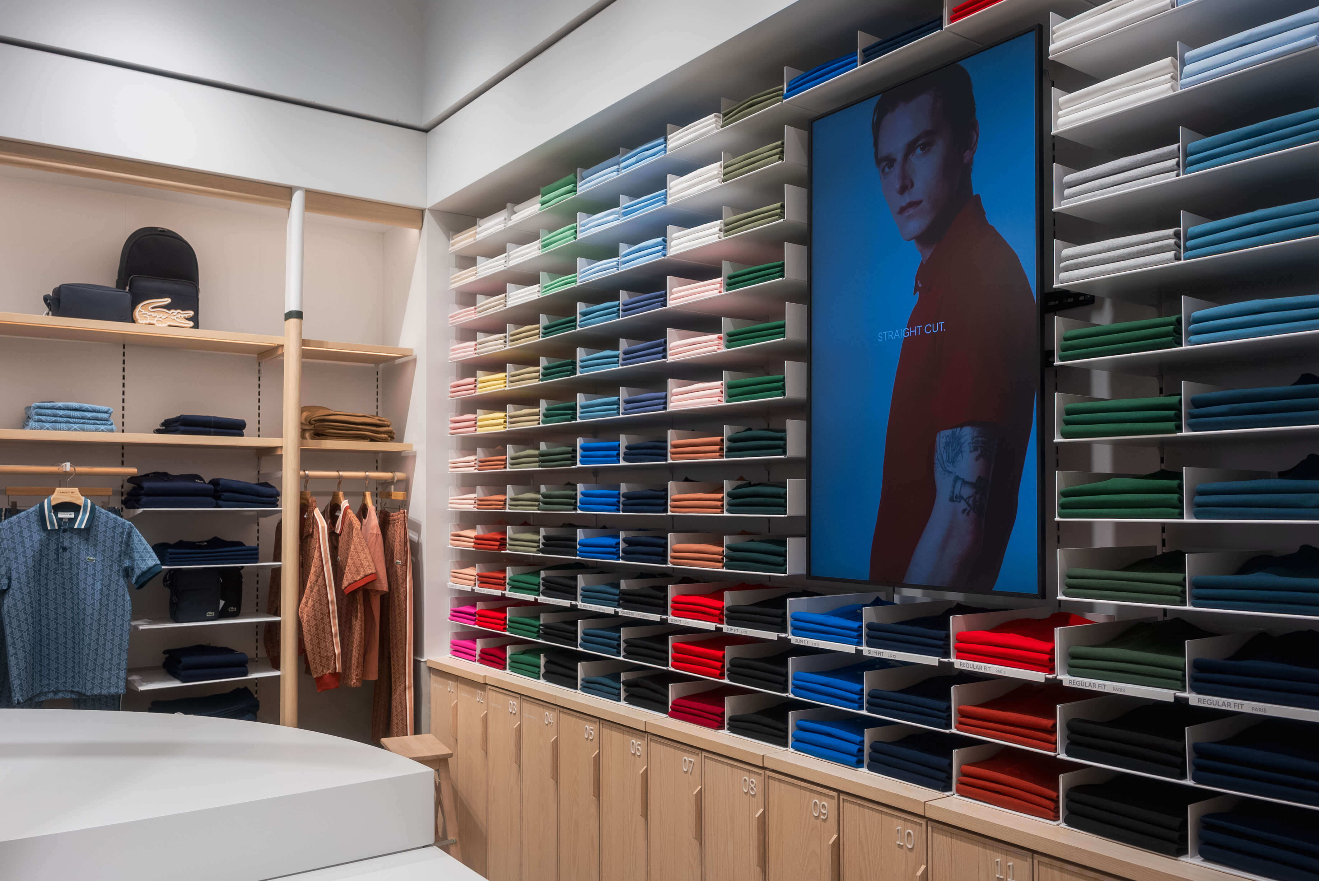 Το polo – ένα iconic κομμάτι που εφηύρε ο René Lacoste – τιμάται με ένα Polo Wall και display tables που αναδεικνύουν ολόκληρη τη γκάμα χρωμάτων, υλικών και σχεδίων.